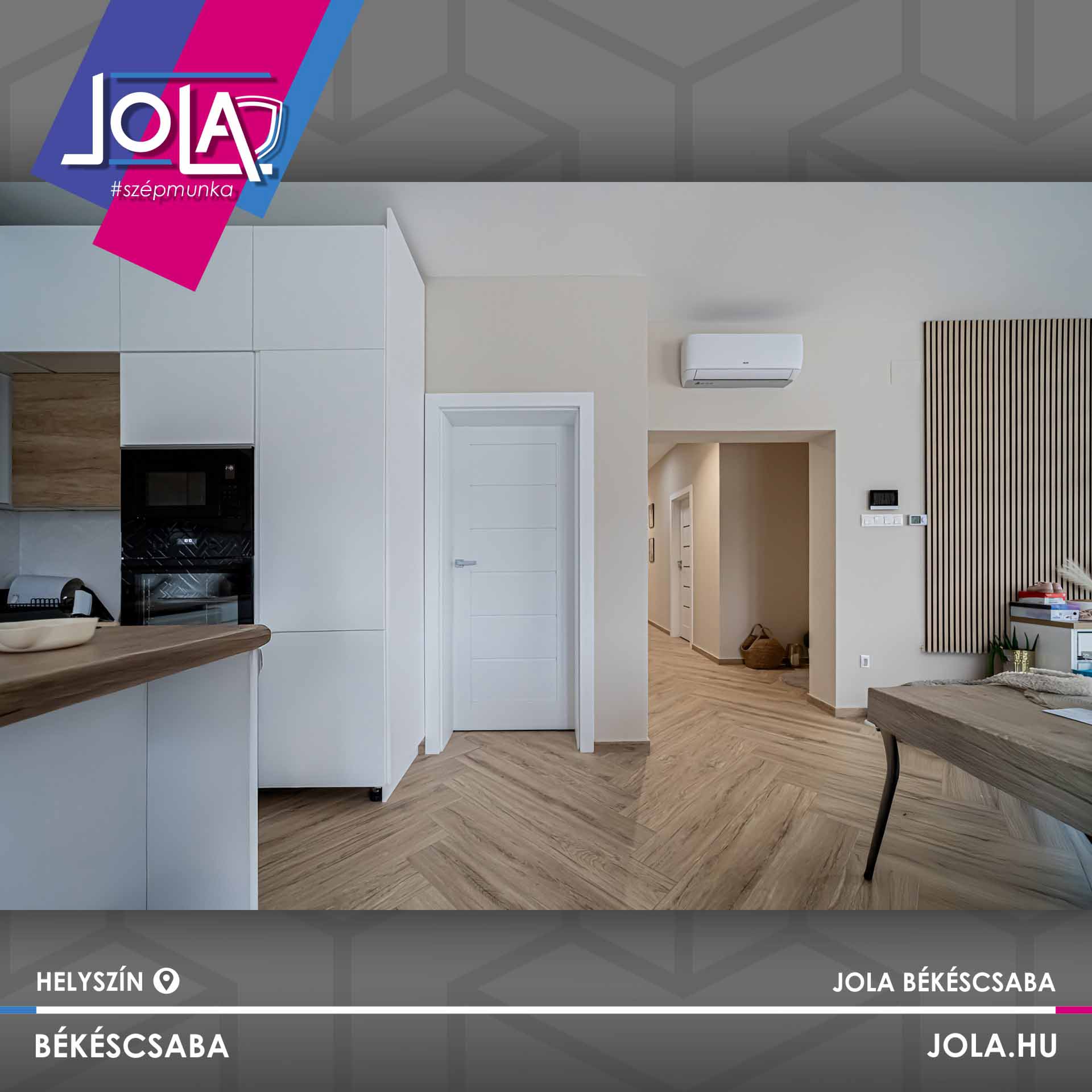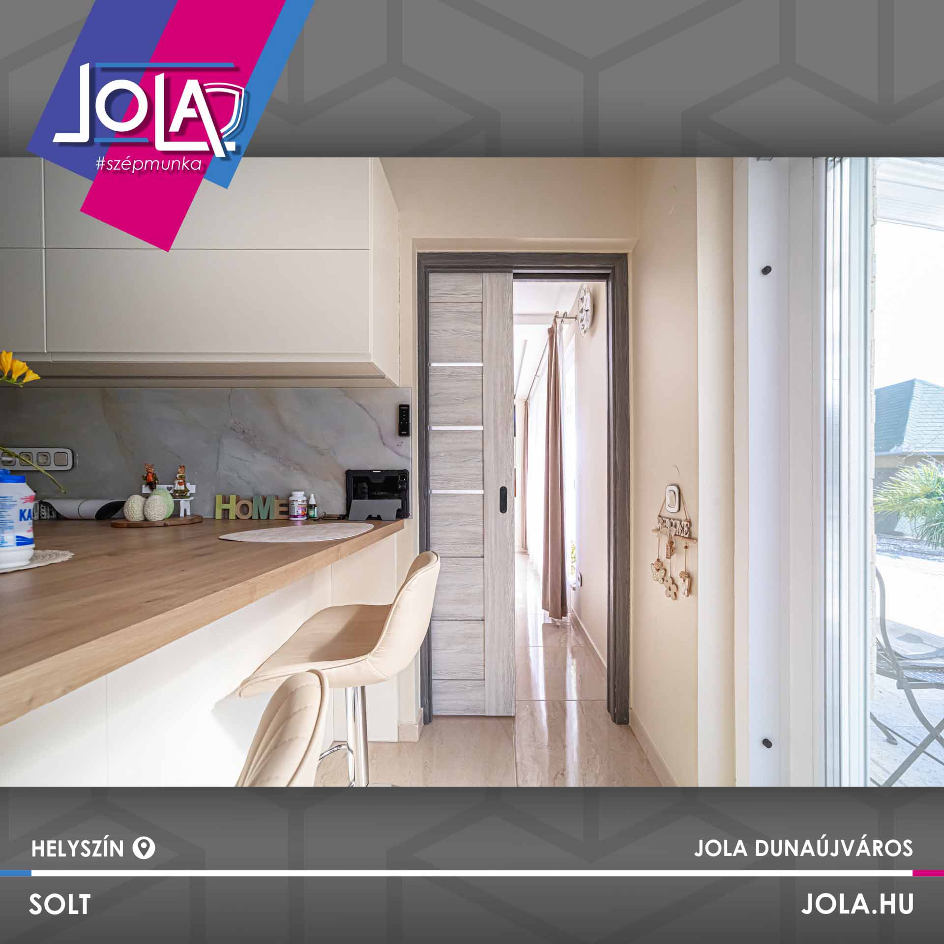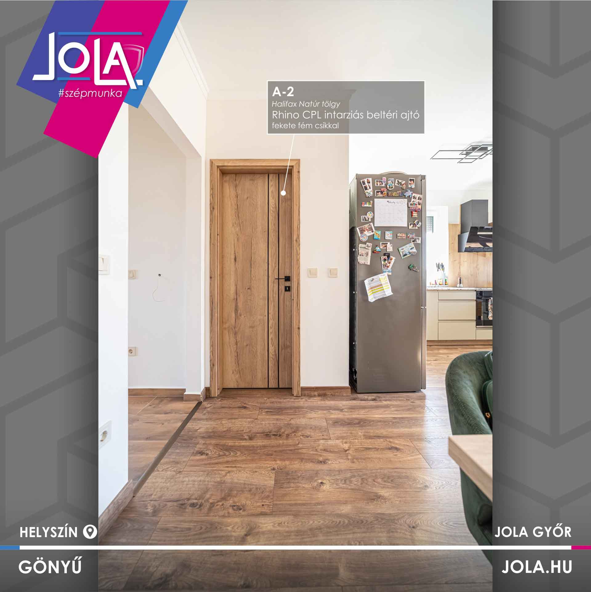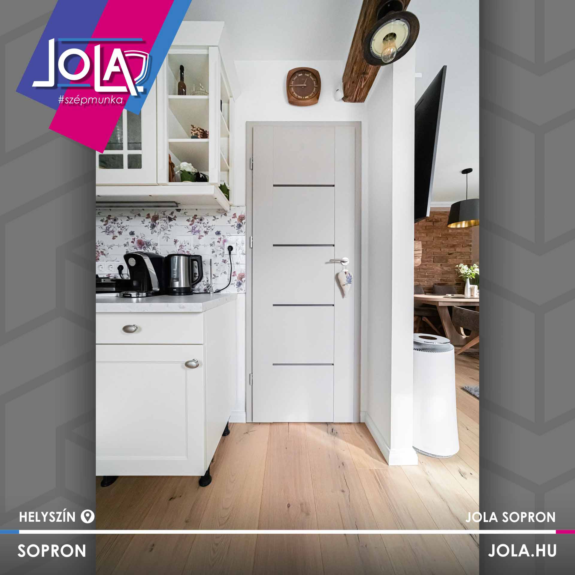 Egyes képeken bejárati ajtó is látható, ami jól mutatja a terek közötti átmenetet és az egységes megjelenést. A részletek összhangja – a konyha, az ajtók, az ablakok és a padló között – egységes, átgondolt enteriőrt eredményez.