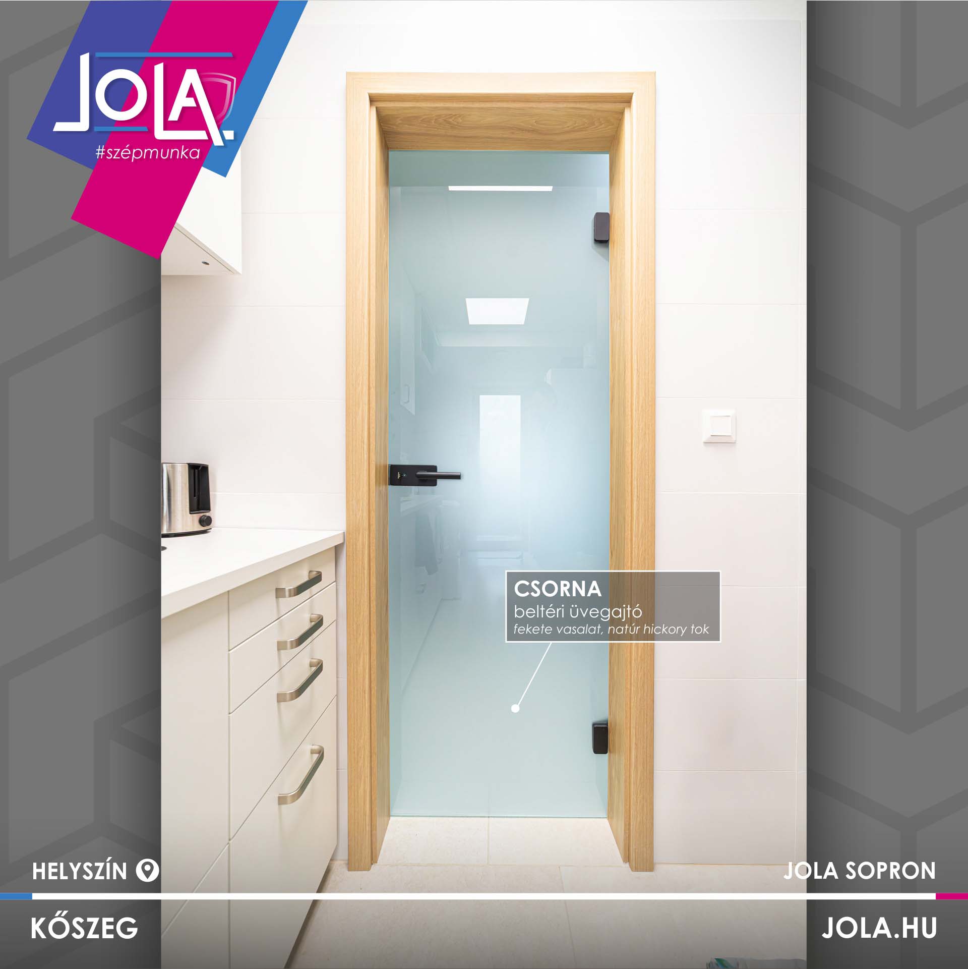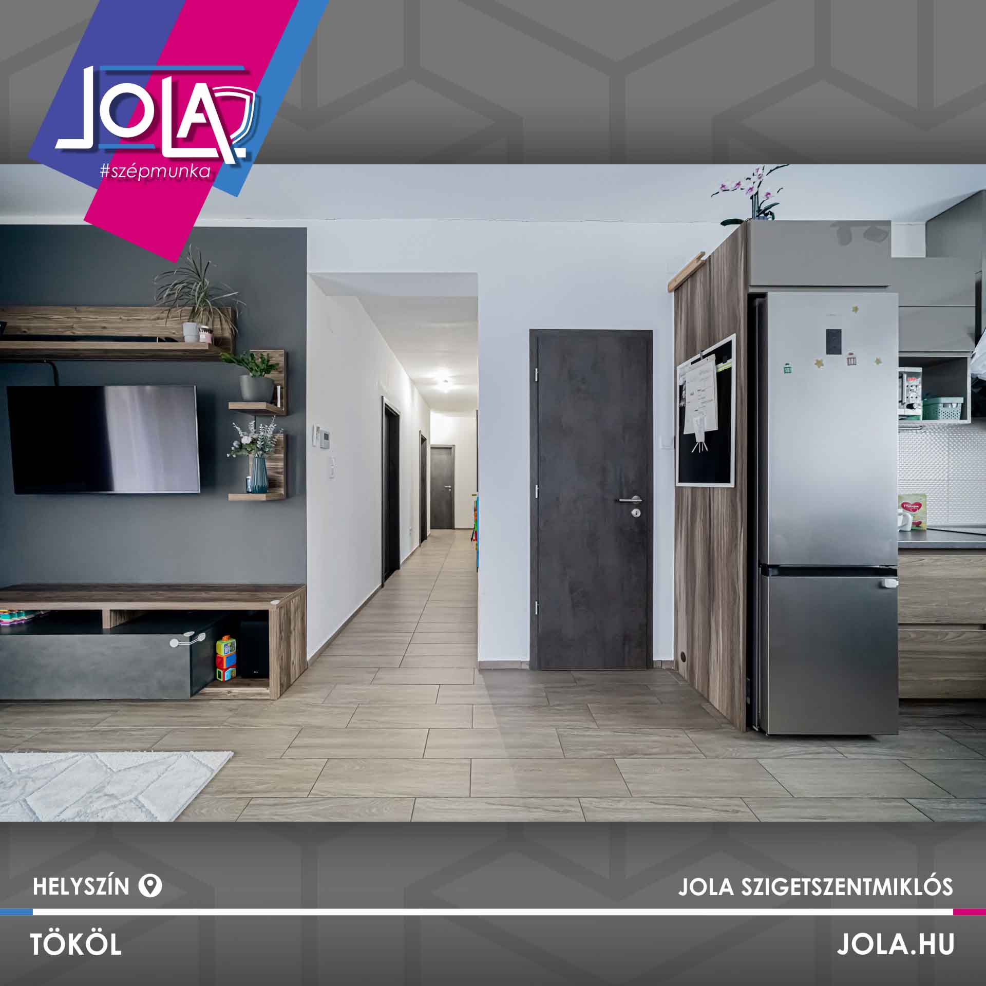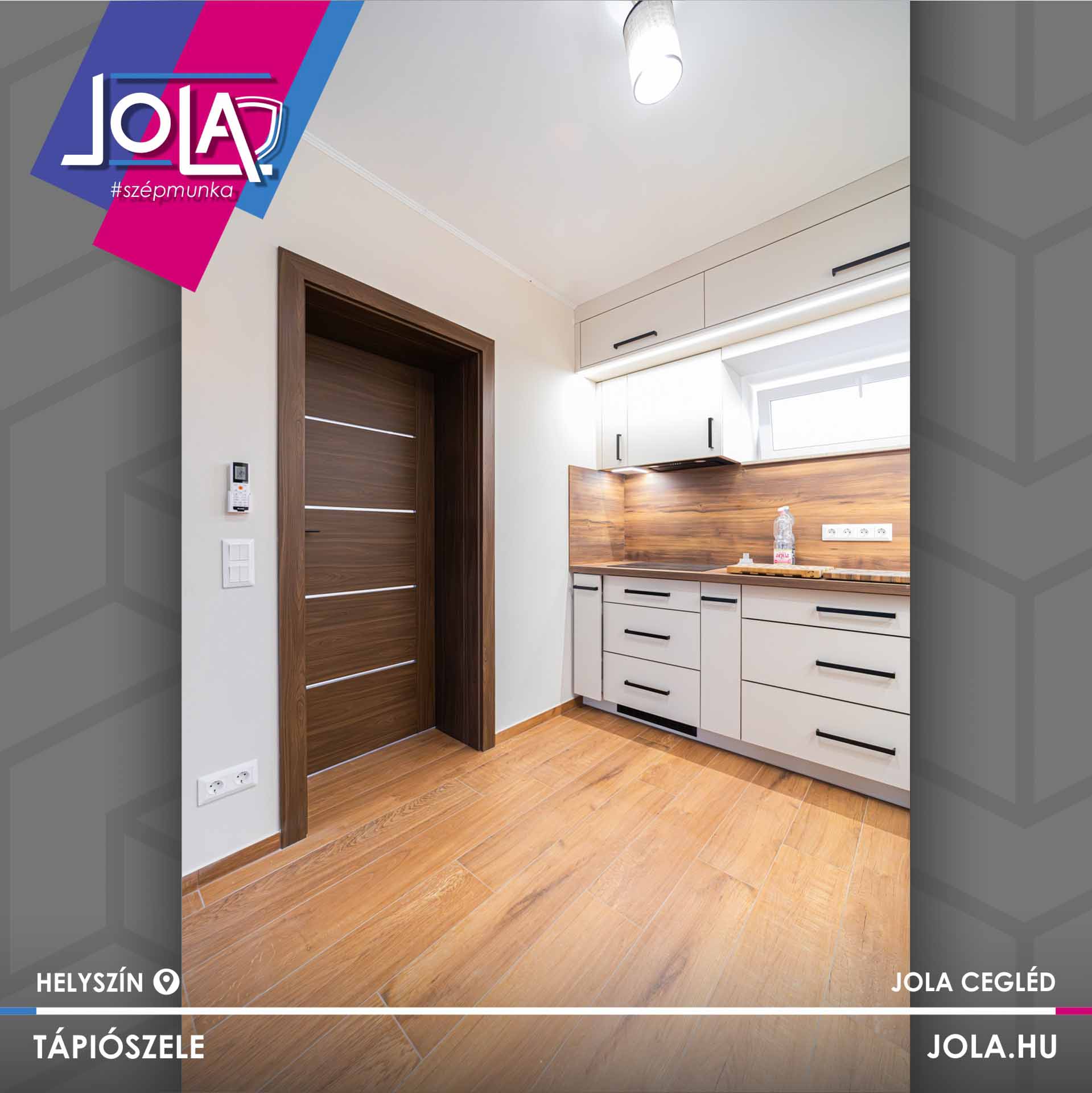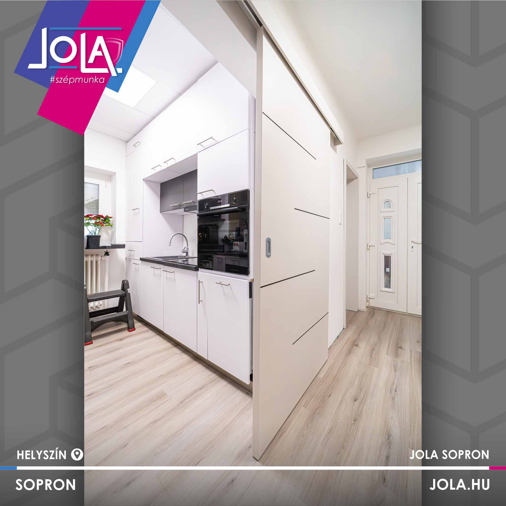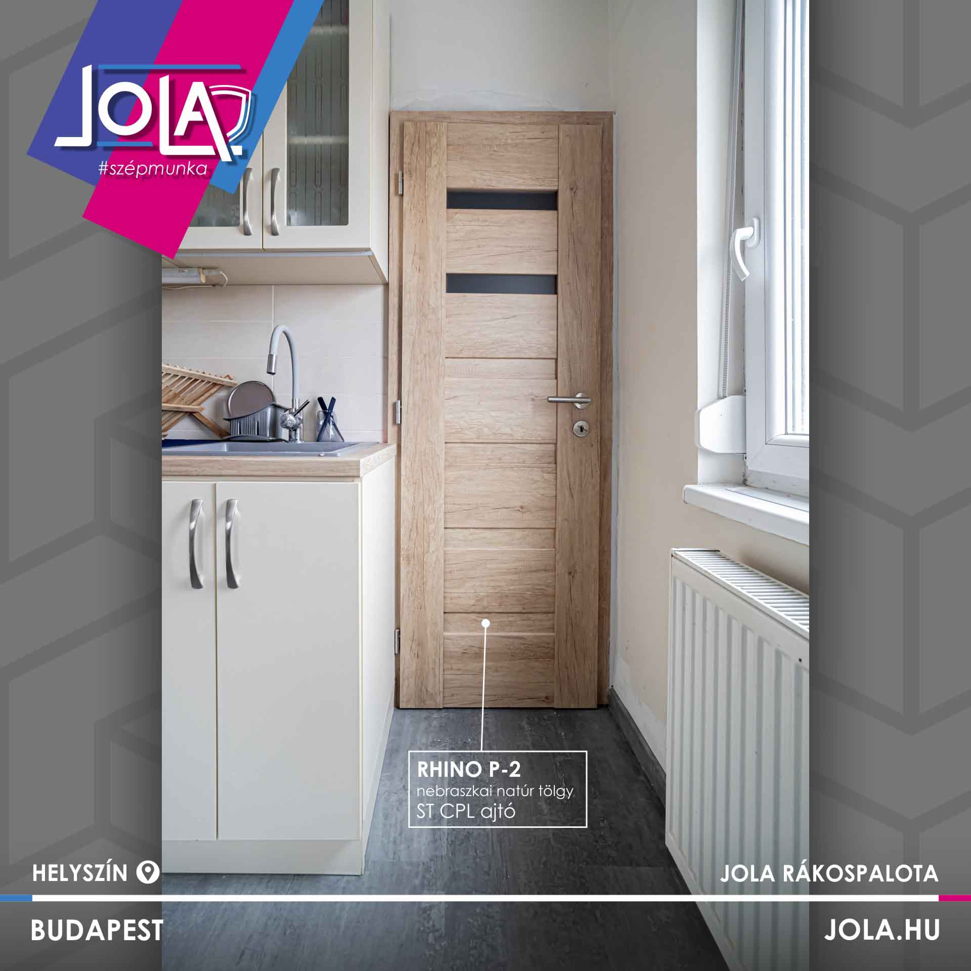 Egyes képeken bejárati ajtó is látható, ami jól mutatja a terek közötti átmenetet és az egységes megjelenést. A részletek összhangja – a konyha, az ajtók, az ablakok és a padló között – egységes, átgondolt enteriőrt eredményez.
